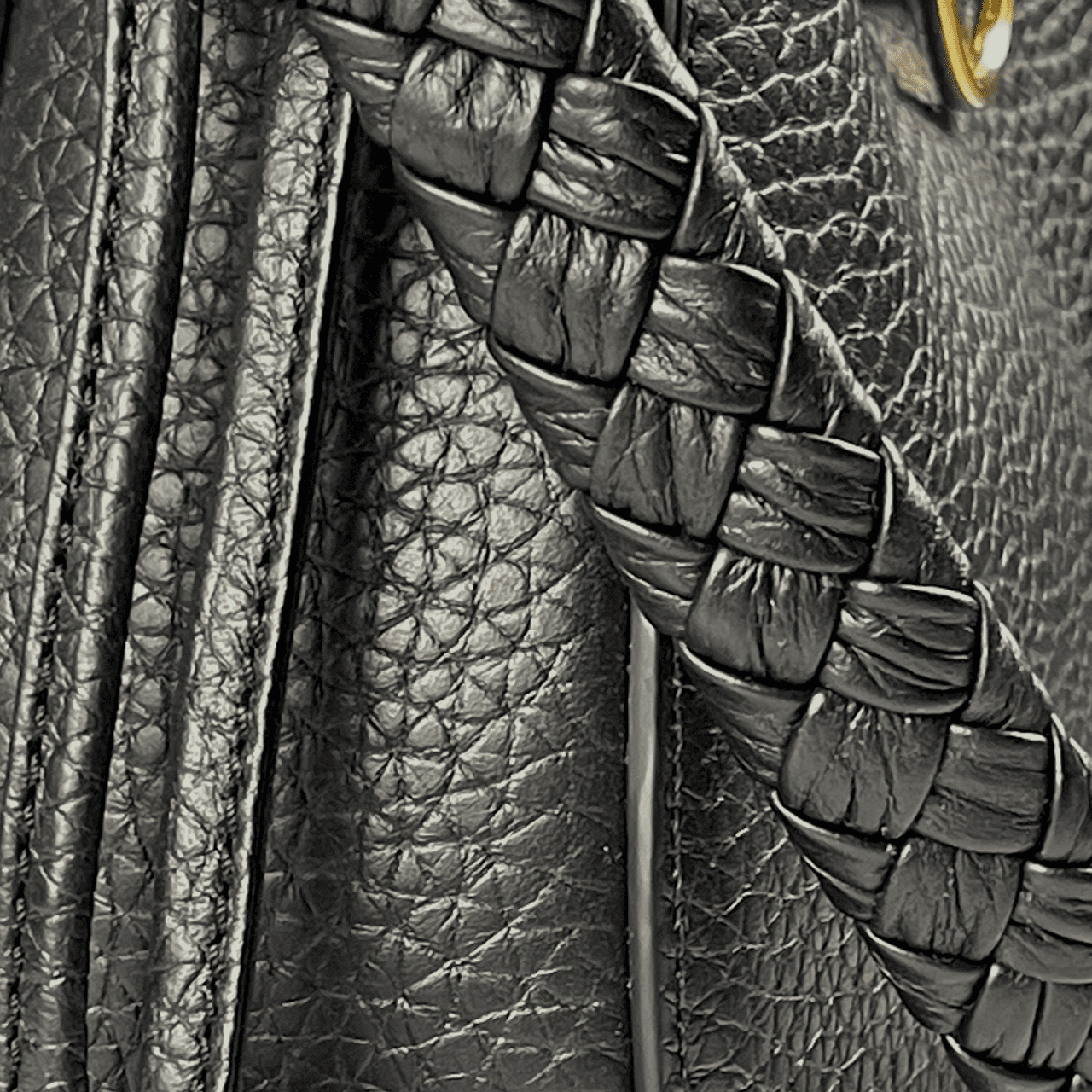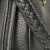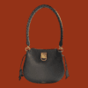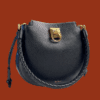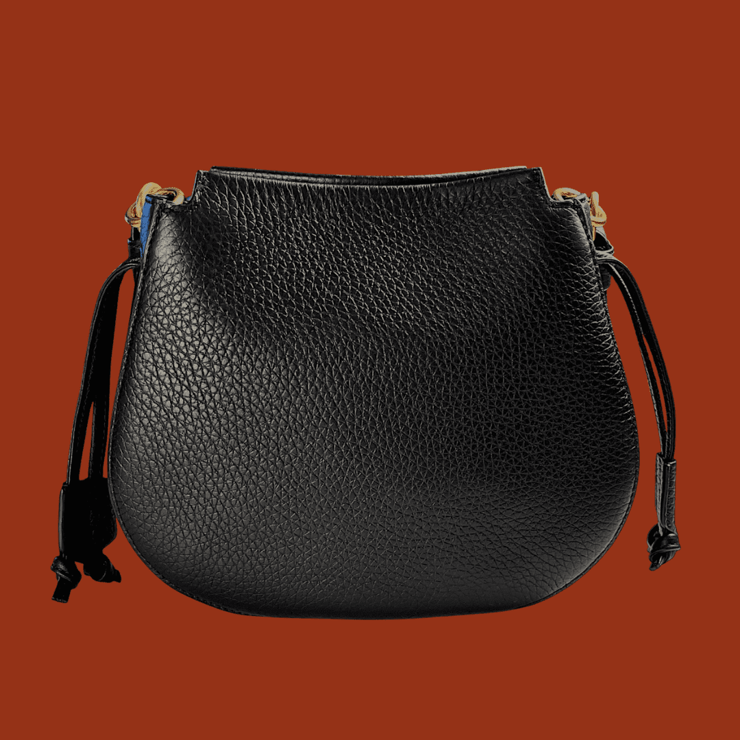 Iris signature lock. Brass hardware. Adjustable/detachable crossbody AND woven leather shoulder strap. Suede lining.