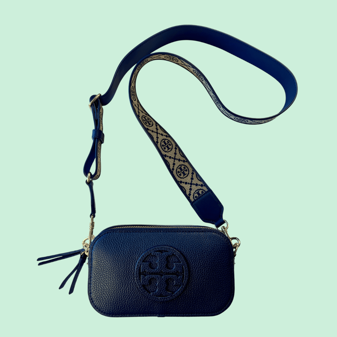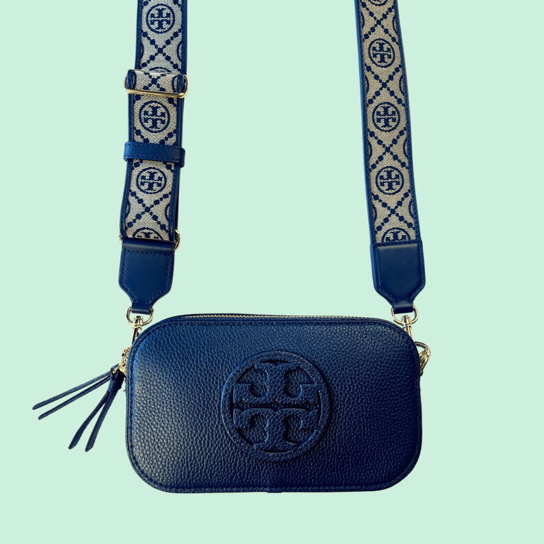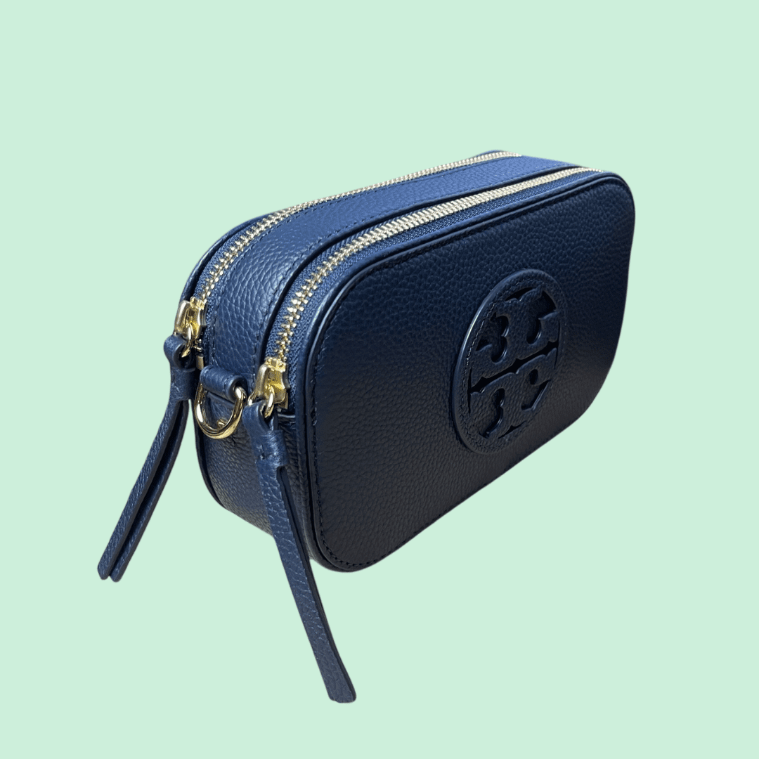 Tory Burch mini miller crossbody handbag in soft navy pebbled leather. Perfect for day or night!